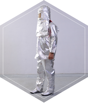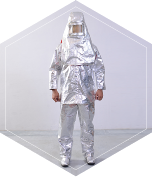 Three layered heat protective suit made from kevlar based aluminized material. The suit consists of suit, hood, glove and boot.